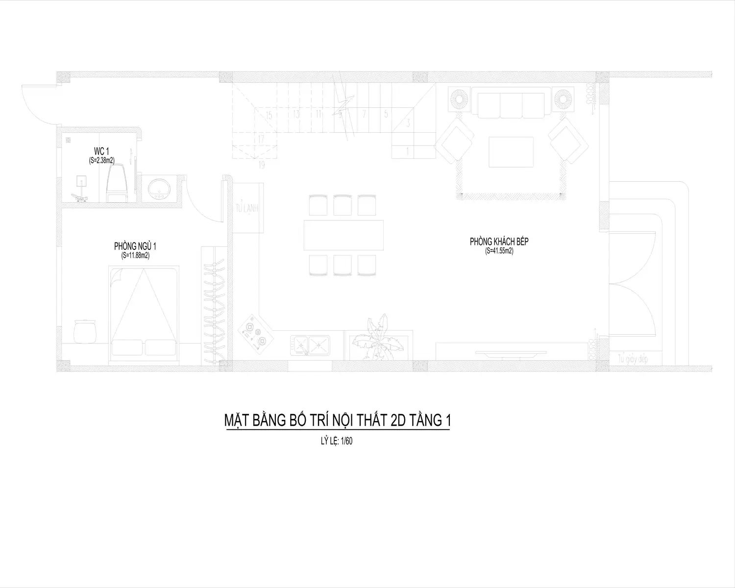 - Tầng 1: Phòng khách, 1 phòng ngủ, bếp+ăn, wc và cầu thang
